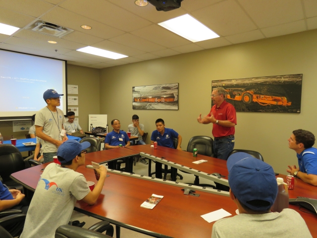 River View Coal是北美最大的在采煤矿,实践团到达后,与矿上接待人员进行了简单的交流问候。随后,此矿主要负责人Ken Ford迅速组织实践团成员进行下井培训,包括River View的发展历史、安全现状、通风系统、采煤方法、井下应急设备的使用及注意事项。入井培训结束后,实践团在Ken Ford和Mark Evans等工作人员的带领下,入井参观了刮板输送机、无轨胶轮车、连续采煤机、梭车等房柱式采煤方法的典型设备。在志愿者吴秀荣的帮助下,大家可以无障碍地与工人们进行提问交流。经过两个小时的井下参观调研,实践团成员顺利升井,并与矿上工作人员共进午餐。