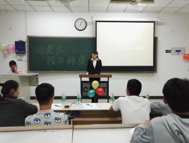 活动现场,首先用一段爱意浓浓的微电影展勾起了同学们对父母的思念,随后参赛者分别用书信,短信,朗诵的方式展示对父母的爱和感恩。书信组共约8个人参赛,他们分别用一份长长的信表达他们对父母的爱。就像余光中的《乡愁》诗说的“乡愁是一枚小小的邮票”,离家在外,总有淡淡的乡愁和对父母思念。短信组共9组,其中安全学院短信组选手张馨宇他用诗一般的语言道出父母对自己的爱。“我们笑,他们高兴,我们健康幸福,他们也洋溢这满足。”而朗诵组,他们用最深沉最魔力的声音大声说出了他们对父母的爱,以表达他们对父母养育教导之恩。
