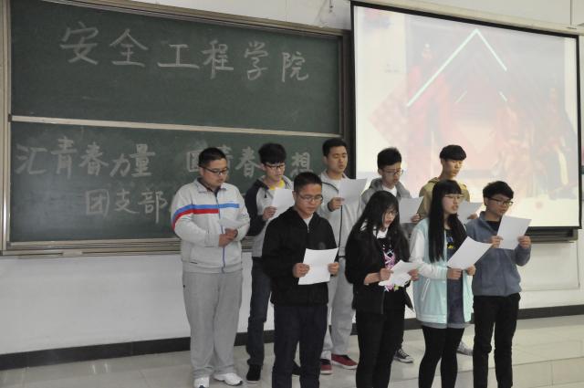 下午4:15分安全学院各团支部展示活动正式开始。主持人开场白结束后首先展示的是14-2班诗朗诵《我们不跪》,他们用铿锵的呐喊表达了青春的骄傲与不屈不挠。紧接着的是14-4班的朗诵——梁启超的《少年中国说》,他们传达的青春融入了责任与坚强。接下来的14-3班带来的朗诵与合唱让现场氛围变得温馨和睦。他们的展示强调了班级内的团结与共同担当。随后而来的是15-5班的朗诵与合唱展示激情洋溢,他们的青春关键词是超越,是超越自我、超越梦想。其中最引人入胜的莫过于15-4班的话剧《青春诺言》,他们将不同时代的年轻人的青春进行了对比,一种是满腔热血信守诺言,一种是随心所欲轻许诺言;一种是抗战时期,战友用30年的血与泪铸就了金石般的诺言,一种是随意应付他人的“诺言”。他们精彩传神的表演让笑点与泪点共存,赢得了场下阵阵掌声。随后15级消防1班和14级消防一班也展示了自己的节目。每个展示过后,孙婷老师都根据其优劣进行了短评与一定鼓励。在长达将近2小时的展示结束后,在场评委与各班团支书通过投票决定了15-4班与14-2班的风采展示更为出色,他们将代表安全学院继续参加下一阶段的表演。