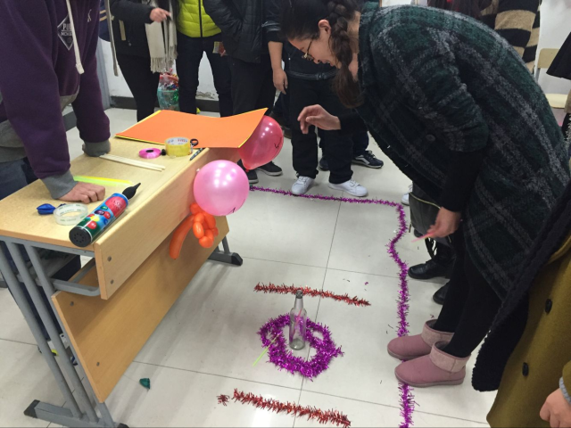 晚上7点,游艺宫正式开始。同学们用五彩的气球,彩带将教室装饰出新年的气息。“魔幻之旅”游艺宫中的“水上浮硬币”难倒了很多学生,“扭转乾坤”考验了同学们的记忆力,“花样青春”中的“护送气球”考验了身体协调能力,团委游艺宫中的“筷子投酒瓶”锻炼了同学们的集中力,还有“抛绣球”、“飞环套圈”“弹球入筐”等等有趣的游戏,吸引了许多同学们关注。