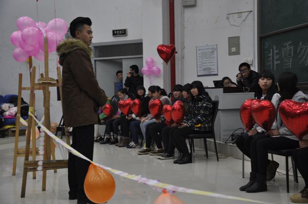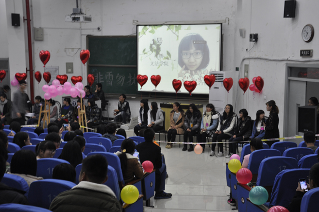 活动现场,各个学院的女生部部员在活动场地布置男女嘉宾海报,让进场的观众领取笑脸贴画,在自己最喜欢的男女嘉宾海报上贴,选出最受欢迎的男女嘉宾。晚上6:30分左右,活动正式开始。首先主持人上台讲述此次活动的各项事宜及意义,之后邀请参加活动的16位女生入场。她们各手拿一个红色心形气球,依次就坐。主持人开始邀请一号男嘉宾入场,先是男嘉宾的VCR自我介绍,接着是女生和四位情感评委的提问题环节,男嘉宾一一回答,最后由女生做出决定,举起气球是拒绝,反之则是接受。很幸运,第一位男嘉宾牵到了自己心仪女生的手。就这样,一位接着一位,期间不乏观众的互动与交流,整场活动精彩纷呈。此次活动旨在给单身男生女生们提供一个认识交流的机会,寻找男女生之间的真正友谊,助其树立正确的爱情观,打破男女生之间交流的隔阂。