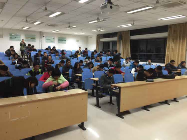 此次竞赛以笔试的方式进行,在博学三楼A区设立四个考场,参赛选手按照分好的座位就坐答题。试题内容涉及人文地理、时事悦乐、音乐电影、诗词歌赋等多方面知识,可谓包罗万象。例如:金庸小说《射雕英雄传》中第一次华山论剑的胜利者是哪一位;法国的普罗旺斯最出名的植物是什么;发表了“新人口论”的著名经济学家是谁等。晚七点,笔试正式开始,活动负责人着重强调了现场答题纪律,希望参赛选手严于律己,诚信答题。下发考试卷后,参赛者沉着冷静答题,考场纪律严明。四十分钟后,参赛选手陆续交卷离开考场,一站到底初赛圆满结束。