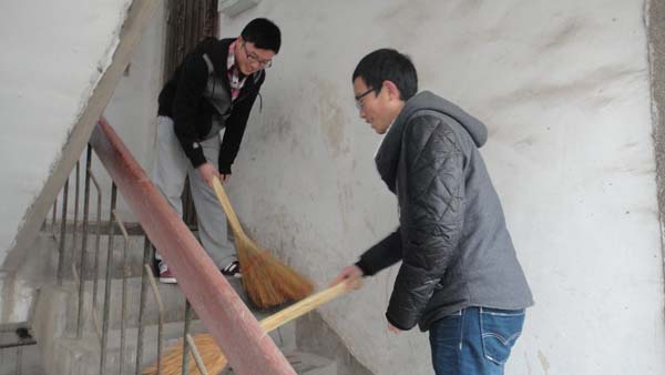 首先,刘老师对这次活动能够举办表示感谢,肯定了大家积极服务的热情,并交代了注意事项和具体清扫工作。清扫工作前,黄岩部长清点人数,并安排人员分组,分区域清扫。安全学院青年志愿者被派分成两组参清扫家属区楼梯和清理楼前草坪上的垃圾。同学们分到任务后便开始忙活起来,认真清扫楼梯上灰尘和残落的树叶。清扫活动一直持续到上午11点结束。