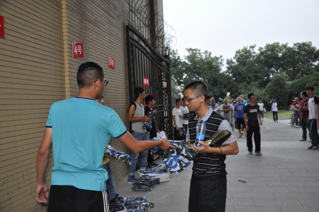 召集15级新生在竹苑三号楼领取军训服装,辅导员郑文奇、何伟民到场指挥。