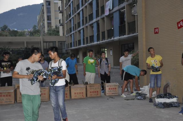 下午六点,在团委学生干部的带领下,2015级全体新生来到竹三领取军训套装。在带队人员的安排下,同学们按照班级次序排好队伍,耐心等待服装发放。首先,负责人安排15-1班的部分男生帮忙在储物室检收衣物,包括上衣,外套,裤子和军帽。接着便开始按序发放,每件单品的每个型号都有专门的人负责,以确保同学们所拿到的衣物型号与自己的尺寸匹配。整个发放工作有条不紊地进行,在辅导员和负责干部的指挥下,工作很快便顺利完成。事后,有同学发现衣裤不合身,辅导员郑文奇得知后,便安排人员进行调换,保证每个同学都能够拿到合适的服装。