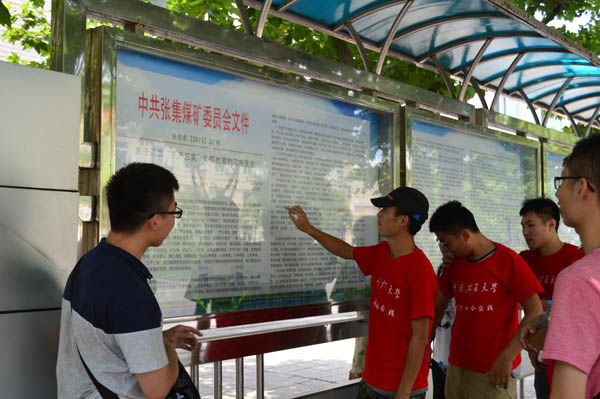 在交流过程中,实践团成员以宣传栏张贴的文件为参考,认真仔细地为大家解读“三严三实”的具体内容思想。“三严”是对修己正身之道的凝练和提升。修身,才能升华思想认识,做到身强身正;用权,旨在以法规为度,做到心正权正;律己,旨在自律,做到行得正、走得端。“三实”是对领导干部作风建设的更高更实要求。谋事要实,就是要从实际出发谋划事业和工作,不虚荣浮夸、脱离实际;创业要实,就要真抓实干,从小事做起,敢于担当责任;做人要实,就要对党、对人民忠诚老实,公道正派。张集煤矿的工作人员在听的过程中,频频点头,不时与实践团成员热烈探讨,本次交流会在活跃轻松的气氛中顺利结束。