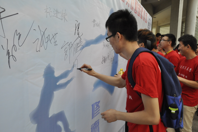 下午5点,大会在庄严的校歌声中结束,师生在“学习‘八字真经’签名墙上签字承诺,与大会领导和省级社会实践团负责人合影。本次出征仪式给即将参加社会实践的同学们鼓舞了士气,相信他们会在即将到来的暑假中绽放绚丽的光彩。