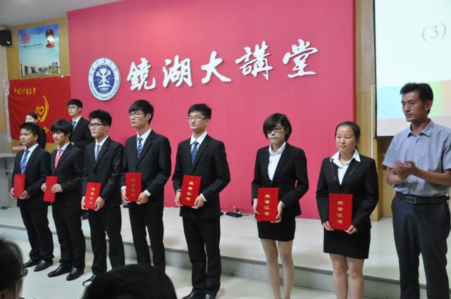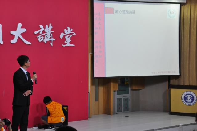 大会流程共分三项,第一项是介绍嘉宾和总队队长脱翔发言。队长脱翔以PPT为载体着重讲述了服务总队的历史以及总队发起的各项活动,例如:爱暖夕阳—援助孤寡老人,图书馆共建—用行动爱护我们的矿大等等,情满矿大,总队为爱插上翅膀。第二项是参赛各学院分队进行3分钟学年工作展示以及2分钟答辩。在各分队展示过程中,首先 “真真切切献爱心,踏踏实实做志愿的口号响起全场,安全学院分队长董齐齐以温婉的姿态向大家缓缓讲述了学院分队的构架组成,分队进行的常规活动—图书馆共建和美化校园,特色活动—爱心班级。在答辩环节,孟老师问道:你认为爱心班级活动最大的困难是什么?董齐齐正声答道:“是不知如何有效的引导各班级建设属于自己的文化,但我们有信心逐步摸索,将这个活动越办越好。”话音刚落顿时掌声四起。环节结束后,孟老师以幽默的语言说道:服务就像谈恋爱,只有用心,你才能体会其中滋味。第三项是主持人宣布评选结果并现场颁奖。安全学院以88.5的总分位居前列,安全分队荣获“标兵服务分队”称号,董齐齐被表彰为“优秀负责人”。