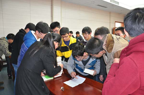 仪式刚开始,孙留涛老师为参与活动的学生讲述本次活动的意义。对于理工科的学生而言,提升自身综合素质,增加人文底蕴,做到文理平衡,适当涉及一些人文社科类书籍是十分有必要的。本次活动的展开,既能丰富同学们的课余生活,也希望能发掘同学们对阅读书籍产生兴趣的可能性。发言中,孙留涛老师结合自己的生活经验,给同学们讲述了读一本好书能带给青年人的启发和指导,也表示了对同学们的深切关心和期望。在孙老师发言完毕后,辅导员郑文奇和各班代表一起给同学们分发书籍,同学们一一上前领书。在同学们读完自己的书后,这些书籍将在安全学院的同学手里流动,与此同时同学们的思想与读书经验也将摩擦出火花。在领到自己想要的书后,同学们纷纷露出高兴的笑容,一起讨论着自己对各类书籍的看法。