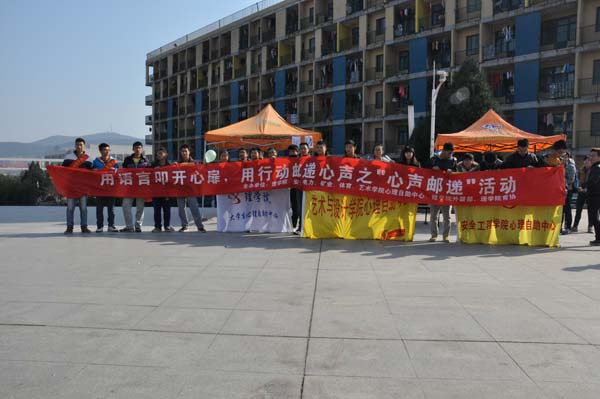 为了拉近同学们之间的距离,使同学关系更加融洽。12月19日中午12点,由安全学院、电力学院、矿业学院、体育学院、艺术学院以及理学院心理自助中心、理学院团委学生会外联部、理学院都成刚青年志愿者协会联合主办的“心声邮递”户外活动在二食堂广场成功举行。本次活动以“人际沟通,部门宣传”为主题,旨在向同学们介绍一些实用的人际交往技巧。