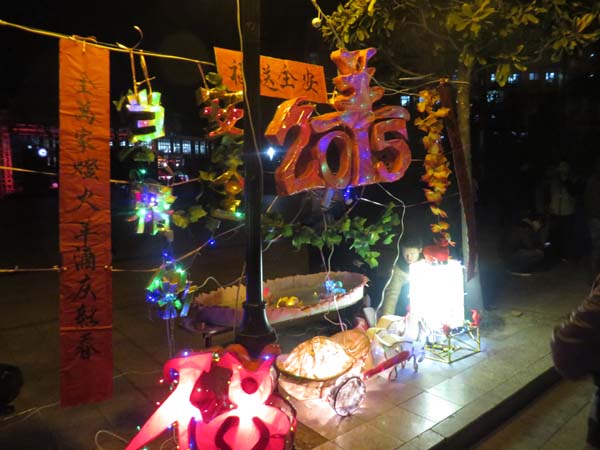 由安全学院同学们精心制作的花灯正摆在二食堂广场前,一副竖挂的“安全送福”的红底对联渲染了欢快的气氛。各式各样的花朵,悬挂着的小灯笼摆放错落有致。正红色块状的“2015”“福”字样与底下的“双羊元宝车”代表了他们对新年的祝福与期望。一盏颇具古风的旋转花灯,发出着耀眼的光芒,并播放着美妙的歌声。这一切都吸引了路人的眼球,并拿出手机拍照或合影留念,热烈的节日气息使同学们忘却了寒冷。