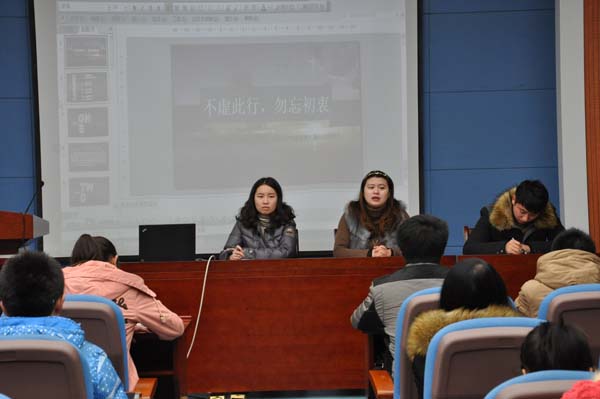 上午11时,活动正式开始。孙老师首先表示这次活动的目的是强化班委责任与服务意识,建设更加优秀班集体。随后孙老师指出期末考试即将到来,班委应该向班级同学明确考试作弊后果的严重性,积极组织诚信考试相关班会,并组织同学们在诚实考试倡议书上签名,确保每位同学都可以诚信考试。紧接着孙老师就日常管理展开讲话,她表示大学生身边存在很多不安全因素,因此同学们一定要注意个人安全,遵守学校纪律。与此同时孙老师还鼓励大家认真复习,积极备考,提高学习主动性,并且培养自己的创新意识。活动最后“不虚此行,勿忘初衷”大学生涯系列活动开幕式拉开序幕。13、14级辅导员助理分别上台介绍了大学生涯规划系列活动的目的、内容及意义。并且鼓励所有同学可以积极参与到活动中去,认真做好自己的大学生涯规划。最终活动在孙老师悉心的关怀与同学们热烈的掌声中落下帷幕。