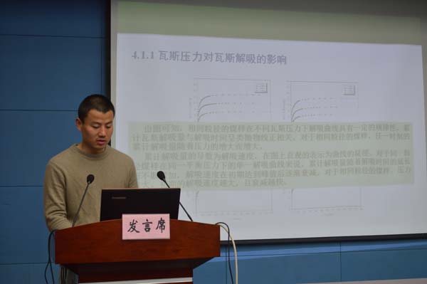 魏伟首先作报告,报告题目是《Ⅰ类自燃煤层自燃氧化规律研究》,他以袁店一井煤矿3煤层为研究对象,介绍了Ⅰ类煤层自然发火规律,内容充实,汇报详细。随后,孙旭明介绍了如何利用均衡通风原理优化矿井通风系统。紧接着是贾靳就海孜7#煤解吸特性做了相关介绍。王斌在报告中阐述了暴露时间对的瓦斯含量测定的影响,在他的报告中研究了暴露时间对瓦斯测定结果各部分瓦斯含量的影响程度。随后,冯辉、杨继超、许浪分别就《贺西煤矿首采层开采后下伏煤层卸压特征研究》、《水力化钻孔径向瓦斯渗流特性实验研究与应用》、《矿井瓦斯爆炸安全距离的探讨》做了相关介绍。