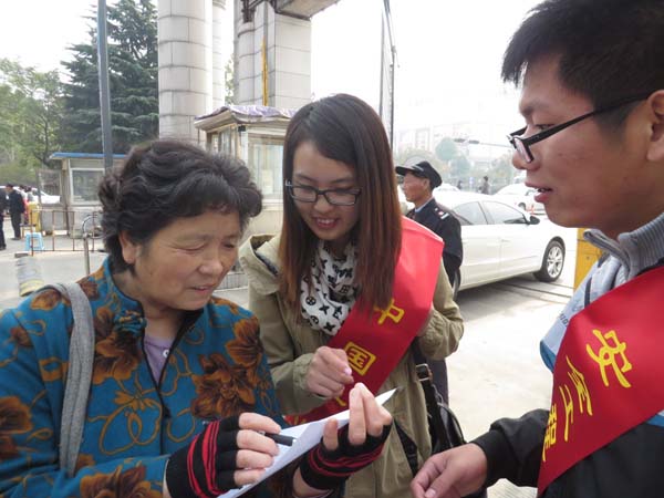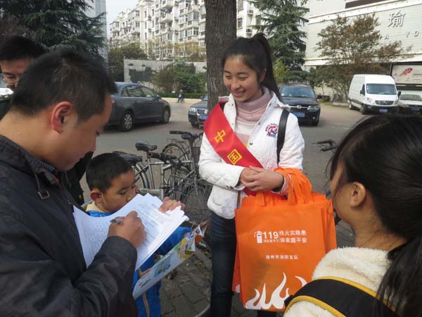 上午8:30,徐州市消防队宣传科科长王配元在风华园门口与同学们会面,并指导他们进行问卷调查工作。面对来来往往的人群,同学们决定分组行动,一部分人在门口拦截调查,一部分走街串巷进行调查。此时,风华园门口已有不少出来活动的老人,他们对同学们的调查活动表现出极大的兴趣。同学们热情地对他们打招呼并将手中的调查表交给他们,悉心地指导他们完成问卷。有的老人视力不太好或不识字,同学们就将问卷上的题目一一念给他们听:“您去人多的公共场所时有看看安全出口在哪的习惯吗?”在同学们的努力下,调查活动有条不紊地进行着。同学们在做调查的同时也会在调查时向周围的人普及消防知识,告诉他们生活中的安全隐患、逃生时正确的做法等等实用小知识。在每位参与者的调查结束后,同学们还会送给参与者一个装着印有消防安全提示围裙和《消防安全知识手册》的袋子,希望他们的家人也能借此学习到一些消防安全知识,消除安全隐患,保证自己及家人的安全。很多市民对同学们的活动表示赞许,认为在人民群众中普及消防安全知识十分重要。上午11:50,同学们的调查活动在收获了厚厚的一堆调查表中圆满结束。