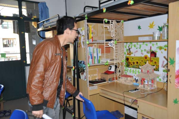 下午四点,评比正式开始。评委团首先到达梅三男生宿舍进行参观、检查并给予打分。检查中他们发现,有的宿舍把中国结、气球等节日饰品挂在墙上,给宿舍营造了喜庆的气氛;有的宿舍把格言、字画等艺术品挂在墙上,使宿舍充满了高雅的气息。特别是B611寝室,每个寝室成员都把个人书桌及周围墙壁全铺上了漂亮的壁纸,并把精致的玩具木楼放在桌上,使评委们眼前一亮并给予高度的赞赏,这也使的他们在本次评比中独占鳌头。也许是因为竞争的动力,隔壁的B6110也不甘示弱,精致美丽的宿舍使得他们获得了亚军的称号。当然女生宿舍这边也丝毫不逊色,特别是竹四A507宿舍以粉红色为主调,走廊、寝室及卫生间贴满了心形图案,充满了温馨的气息,最终也获得第三名的好成绩。