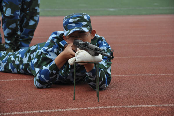 14级新生匍匐握枪,凝神瞄靶的画面在第二运动场定格,在接下来的训练中,他们的努力将会在射击比赛中得到检验。