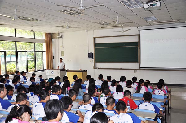 下午3点整,“校规校纪与安全教育”讲座正式开始。钱书记首先简单地向14级新生阐述了大学学习生活的基本要求,随后重点阐述了校规校纪的重要性,进入讲座的主题。钱书记从我校的校风、校训、校园精神和办学理念讲起,强调我们的大学必须要有规则,而我们学校的校规校纪也充分体现了我校的校风、校训、校园精神和办学理念,借此阐述了大学的理念和学生安全纪律教育之间的关系。随后,钱书记为10级的新生分析了近几年来我校学生违纪的特点及违纪的原因。钱书记通过丰富的案例对违纪现象的发生做出了详细的分析。钱书记强调,14级新生要回去认真学习《学生手册》,要遵守学校的各项校规校纪,尤其不能考试作弊、打架斗殴、违章用电和夜不归宿。他还提醒新生们要特别注意,一是受到过记过及以上处分者将不授予学士学位,二是学生的处分决定将放入学生的个人档案。针对学校所处的复杂环境,钱书记还特别强调同学们要注重人身和财产安全,不要独自外出,并且要严格执行晚点名制度,他还结合一些真实案例,指出身边的安全隐患,大大提高了同学们的警惕性。