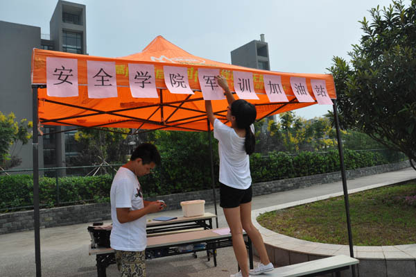 军训是2014级新生进入大学来最具挑战性的第一课,安全学院的团委学生会及党员工作站为了给新生们提供更好的服务,特意在第三运动场搭建了加油帐篷,意在帮助新生们在军训期间克服种种困难,圆满完成军训任务。站点采用轮流值班制度,学院主席陶冰冰事先给学生会成员和各班积极分子安排了值班表,使得站点值班活动能够有序开展。每天的值班活分为上午、下午两班,上午值班人员要在8点之前将饮水机、医药箱、热水壶、雨伞和喇叭等必备物品安置到位,并确保饮水机的水量充足。下午值班人员则负责在7点之前将东西归还储物室。联合办公室部长王泽民还特别强调值班人员要时刻注意药品是否有短缺情况,如有短缺一定要及时补上。并且值班人员要仔细留意军训期间新生是否有身体不适或意外受伤的现象并及时处理和解决,努力为新生们排忧解难,使得他们能以最佳状态去面对军训的考验。