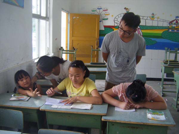 这里的同学多为5、6年级的学生,作业也都是暑假练习册,这也方便了志愿者们进行集体辅导。大多数小朋友都是非常乐于参加此次活动的,可是也有一些小朋友不愿意写作业,想去做一些团体游戏。最后在志愿者们的共同努力下,同学们愿意配合志愿者们去参加此次作业辅导活动,志愿者们也答应同学们写完作业后带他们做游戏。邹俞先和刘文静负责语文教学,谭佳昕和张悦负责英语教学,曾梦茹和鲁守正则负责数学辅导。小朋友们遇到不会的题目可以举手示意,志愿者们便会来到小朋友们的旁边给他们耐心讲解。等到大约一个小时之后,志愿者们会把被问到的高频率题目收集起来,给小朋友们集中讲解。在这次作业辅导中志愿者们发现,同学们的英语普遍不好,而且对于学习英语的热情也不高。对此,志愿者们为同学们们讲了“短板效应”:一个人只有全面发展才能够最大程度的发挥自己的作用。懂事的学生们听了也向志愿者们保证以后会端正自己的态度,好好学习英语。在作业辅导完成后,志愿者们也遵守自己的诺言,带着同学们做游戏。活动结束后,同学们纷纷表示很喜欢这次的作业辅导,在巩固了旧知识的同时也学到了不少新知识,而且活动结束后的团体游戏也让他们在学习后得到了充分的放松。