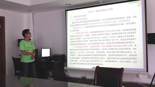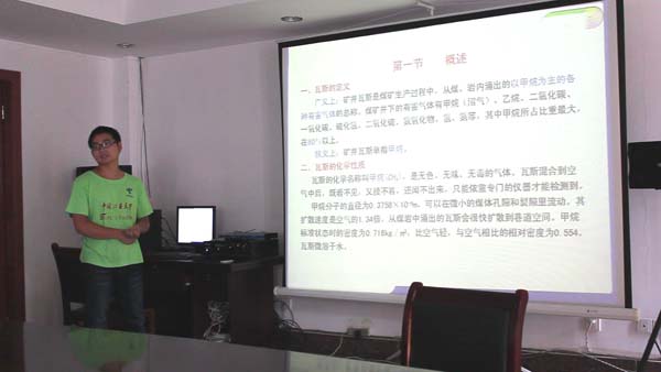 在读博士生郭汝林主讲。郭博士首先感谢矿区在社会实践过程中的大力支持,随后表达了希望自己能够为矿区职工带来新知识、新想法的良好愿望。郭博士针对金黄庄煤矿开采地质条件复杂,瓦斯压力大,瓦斯含量高的特点,介绍了瓦斯的概况、瓦斯含量综合评价指标,并结合自身学习和做科研项目的经历,与大家探讨了煤与瓦斯突出及防治技术。紧接着郭博士结合国内外的最新研究成果,阐述了井下瓦斯监测与管理内容。在接下来的时间里,郭博士着重讲述了煤矿瓦斯综合利用措施等当前热门内容,对金黄庄煤矿的瓦斯抽放系统给予高度评价。郭博士籍此机会,也向矿区推广韩国三级