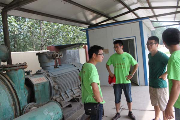 上午九点,实践团成员在技术员马耀的带领下,首先参观瓦斯泵站。金黄庄煤矿地址条件复杂,瓦斯含量高、压力大。为积极应对瓦斯灾害,金黄庄煤矿建立了包括泵站在内的完善的瓦斯地面抽采系统。该系统一方面可以有效地进行瓦斯治理、消除突出危险性;另一方面能将井下瓦斯收集起来,变废为宝,在减少排空污染的同时,合理利用资源进行发电。马耀技术员详尽地解释了泵站的工作原理和操作措施及日常工作管理流程。实践团成员结合所学知识,进行论证,表示该措施科学而卓越。随后实践团参观了风机在线监测和管理系统,工作人员介绍了设备的使用情况。本系统能有效监控井下通风安全情况在发生危险时,及时地采取反风、控制局部风量等措施,为井下人员的逃生和救护工作提供生命保障。