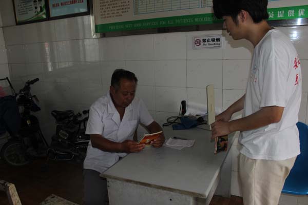 早上9点半,全体队员准时到达葛楼社区。根据实际情况,队长杜杨给每位队员们简要的分配了负责的区域,并嘱咐队员们表明身份,注意礼节。随后队员们开始了各自的送书之行。在送书过程中,队员孙明哲来到了葛楼社区卫生服务站并与值班医生王医生进行了交谈。他询问了王医生有关阅读的情况,然后向他赠送了精心准备的书籍,并鼓励王医生多看书,培养读书意识。王医生深切感谢了他的好意,同时他也鼓励同学们要好好学习,为实现中国梦而加油。上午十一点,此次实践活动圆满结束。