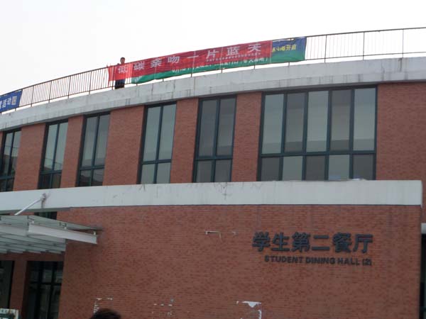 到达指定地点后,“寻找蓝天”社会实践团拉开了定制的横幅――低碳亲吻一片蓝天。横幅由团队的两名成员固定,其余成员向市中心的游客和居民宣讲环保的重要性,并给他们提供笔到横幅上签字。活动刚开始的时候,实践团的成员稍稍感到一丝害羞,不好意思向路人开口介绍此次活动,但在活动小队长鹿通的带领下,成员们逐渐的大方起来,积极的向沿路行走的人宣传环保的知识,不少市民十分赞赏实践团的行为,并愉快地在横幅中间签下了自己姓名。随着越来越多的路人在横幅上留下自己的承诺,小队成员们更加有信心使环境保护的意识扩散到人群中。不管老人还是小孩,妇女还是青年,他们都为环境的保护做出了承诺。活动过后,过往的市民纷纷将垃圾扔到了垃圾箱里,就连街道保洁人员也对实践团开展的活动赞不绝口。下午,“寻找蓝天”暑期社会实践团的成员将横幅挂在了学校二食堂的广场上,希望横幅的力量也可以让在校的同学们为环保出一份力。