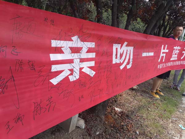实践团在市中心一天的努力取得了可喜的成效,横幅上写下了满满的承诺和保证,希望这些承诺不仅仅停留下纸上,还要停留在人们的实际行动里,真正做到低碳亲吻一片蓝天。