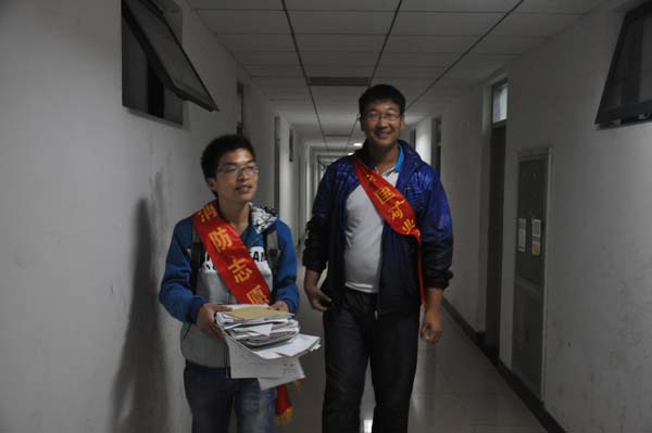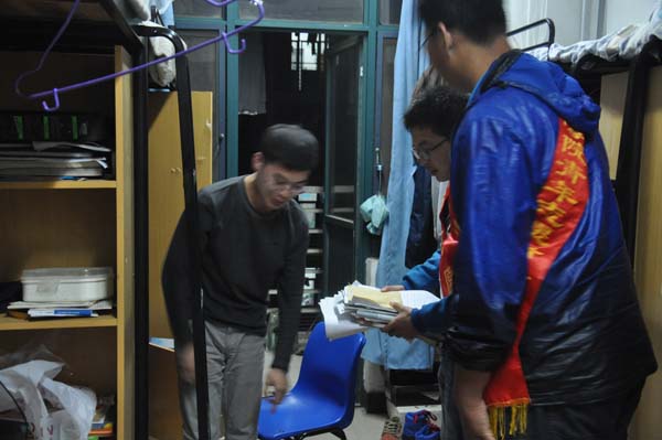 青协的成员被分成了2队,每次分别对2个楼层的每一个宿舍进行善款筹集。队员们有礼貌的敲门问候,讲明自己的目的后,宿舍里的学生都会很礼貌的回应,并将宿舍内所有用不到的废品以及用过的书籍递给筹集善款队员手中,队员们点头感谢后便又去下一个宿舍筹集。就这样,活动一直持续了一个半小时,筹集了许多塑料瓶和书籍,表现了安全学子对慈善活动的大力支持。