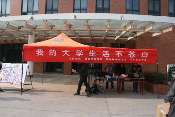 大学是人生独特的一段旅程,充满生机,充满创造。为了丰富大学生生活,体现当代大学生生机勃勃的姿态,安全学院青年志愿者协会、电力青年志愿者协会和孙越崎青年志愿者协会于11月22日中午在二食堂广场联合举办了“我的大学不苍白”主题活动。