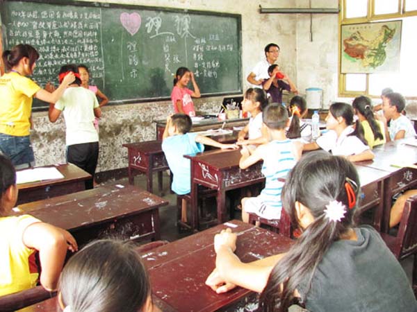 安全学院暑期实践团队——“141”展翅微笑志愿队,在白石台小学开设心理健康教育课程。