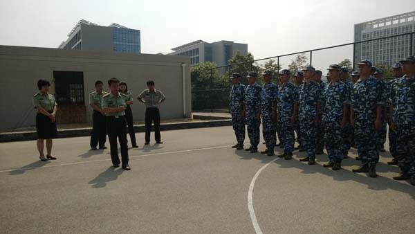 新生军训地点,对安全学院13级新生的军事技能训练进行视察及指导。学院党委副书记钱雄和辅导员孙婷老师向李建老师对安全学院新生军训情况做了详细介绍。