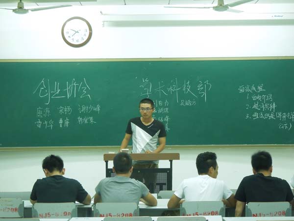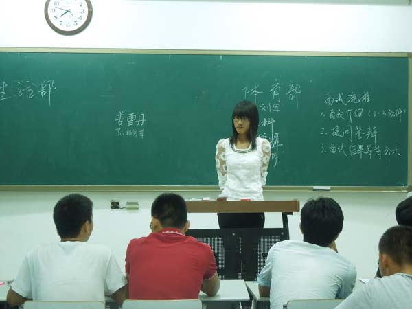 晚7点整,招新会正式开始。各部门按照分配好的教室入座,青协、女生部在B201,心自、知行社、新闻宣传中心在B202,组织部、办公室在B204,外联、文艺部在B205,创业协会和学术科技部在B208。根据招新的流程,参加招新会的13级新生首先要进行简短的自我介绍,他们幽默的自我介绍不时引起现场的阵阵笑声。在自我介绍之后,各部门的部长根据新生的介绍并结合部门的特点进行了相应的提问,这个过程不仅让部长们对于新生有了更深的了解,更能充分展现新生的个人素质。虽然参加招新的新生很多,但是新生们还是按照签到表的顺序轮流上台,招新会得以秩序井然地进行着。