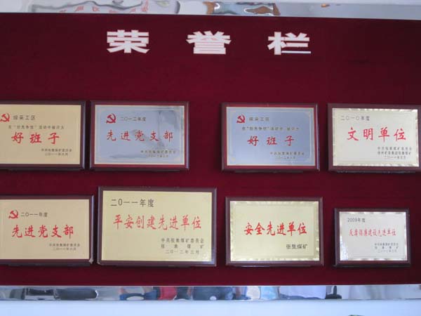 接着马主任带着实践团成员来到了矿工们平时开会的会议室。在会议室有着差不多60-70个座位,会议室旁边悬挂着近年来张集矿所取得的一系列的荣誉,像“文明单位”、“安全先进单位”以及“先进党支部”等,这些足以说明张集的成绩显赫。