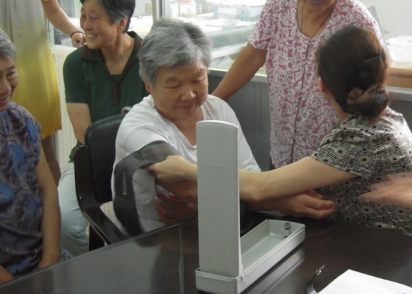 上午九点多钟,一切准备妥当之后,实践团的成员们分成两个人一组,分头来到了之前来过的空巢老人的家中,搀扶行动不便的老人们来到社区卫生服务站,大概花费了半个小时的时间,将之前联系好的十位空巢老人都接送到了服务站。有这样一次免费体检的机会,老人们都露出了幸福的笑容,对自己的健康状况也显得信心满满。利用上午两个多小时的时间,卫生站的医务人员给老人们血压,心率等老年人比较容易出现老年病症状的地方进行了检查。