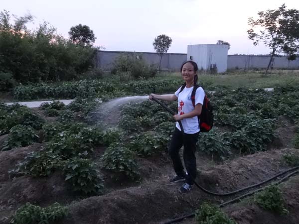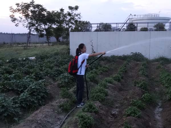 生态园内,一排排的农作物显得生机盎然。刚一进入生态园,队员们便摩拳擦掌,跃跃欲试了,大家纷纷拿起工具,走进田地,开始劳作。有人浇水、有人除草、有人摘菜……夜幕渐渐降临,但田园间依旧可见穿着印有“中国梦”红色字样的一群大学生在田地里劳作,周围蚊子也时不时过来凑个热闹,肌肉的酸痛让人难以忍受。但是,队员们依旧合作无间,他们还是不厌其烦的扯着水管给田地浇水,蹲下来除草,帮忙摘菜,握着铁锨松土……