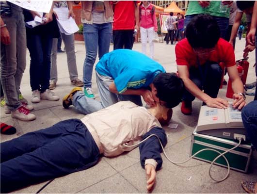 党员工作站特意向学院借来了心肺复苏人体模型,通过现场教学演示,向大家讲解怎样正确进行人工呼吸、心脏的按压等应急措施。活动期间,路过的同学们都积极参与互动,认真学习救护技能,现场气氛活跃,很好的达到了宣传的效果。