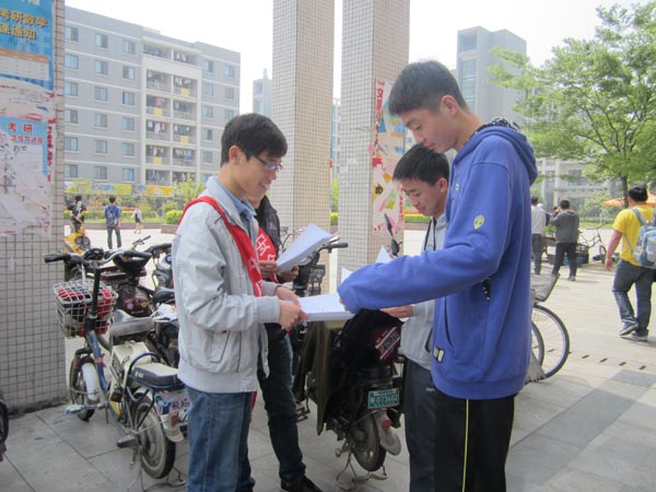 活动正式开始后,E组组员由组长王龙飞带领着共同认真学习有关“世界读书日“的知识和信息。当同学们渐渐经过说三食堂时,活动成员们将自己手中的”世界读书日“宣传单发放到同学们的手中,并和大家一起探讨世界读书日的由来:“1995年,联合教科文组织宣布4月23日为‘世界读书日’,以鼓励人们阅读,以纪念那些为促进人类社会和文化进步做出极大贡献的人”,并且,同学们还相互分享自己对“读书“的认识。除此之外,服务分队成员们共同倡导大家:“读书从我开始,让图书馆不再只成为你的自习室。”组长王龙飞强调:“读书需要天天坚持,而图书馆就是我们读书,看书的好地方,我们应该好好珍惜。为了让更多的人对读书更加的重视,活动人员们还在同学们的宿舍楼层了张贴了宣传单,共同学习与勉励。