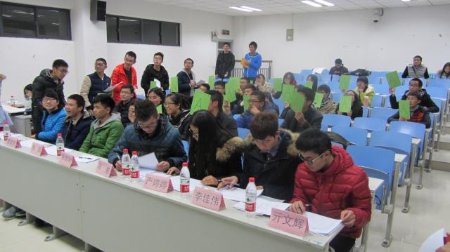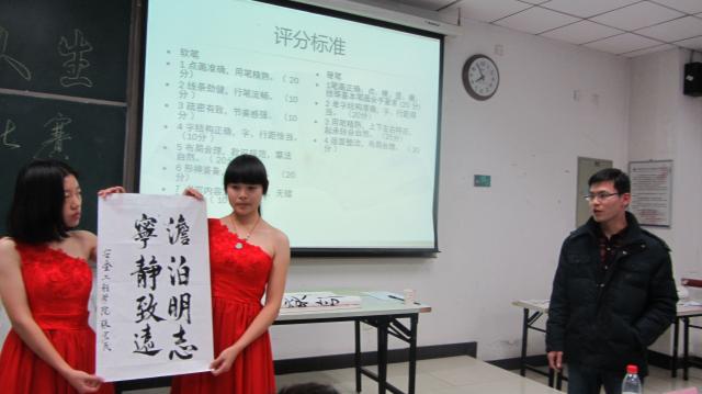 晚上7点,比赛正式开始。经过三个星期的初赛选拔,共有9位软笔选手,15位硬笔选手进入决赛。介绍完此次参与的评委后,主持人对比赛环节进行了讲解。本次书法比赛共分为两部分,第一部分是现场书写,参赛选手现场进行硬笔和软笔展示,书写完毕后对自己的作品进行讲解;第二部分是书法知识问答,总共选取了10个有关书法的问题,参赛者通过举牌的方式进行回答。评委通过第一环节和第二环节的综合得分进行评选。比赛结束后,陈学利老师对于首次举办的书法比赛进行了精简总结。