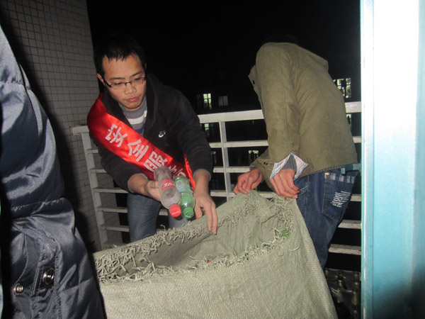 晚上9点半,服务分队成员首先在梅三一楼集合。在F组组长文相飞的带领下,队员们携带工具到达梅二、梅三安全学院学生宿舍开始废瓶回收活动。在经过各宿舍的同意之后,队员们依次走进每个宿舍的阳台,分工合作,将同学们平日喝完饮料后堆积在阳台的废旧塑料瓶装进大麻袋。得知队员们的来意,宿舍的同学们纷纷积极帮助队员们整理,贡献自己的力量。从各个宿舍收集来的塑料瓶数量可观,加上瓶上的灰尘积聚,增加了许多工作量,但服务分队队员们任劳任怨,不到半小时的时间就将各个宿舍阳台的废旧塑料瓶清理回收干净。
