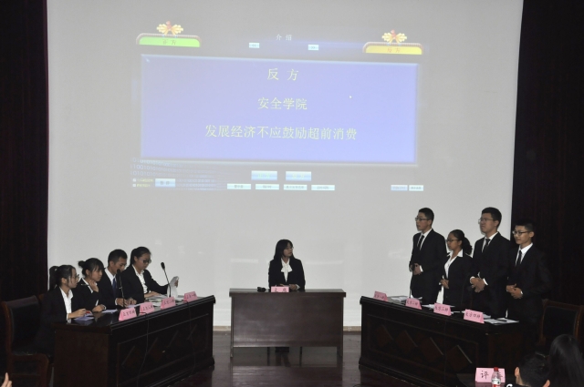 首先,主持人介绍了到场嘉宾、正反方辩手、本次辩题以及比赛规定,并宣布辩论赛正式开始。接下来,双方就发展经济应不应该鼓励超前消费的问题展开辩论。立论环节,正方文法学院从鼓励超前消费刺激市场,改善人们生活两个方面立论,反方安全学院从资源环境和市场调节方面进行论述。攻辩环节,双方二三辩轮流提问,一针见血,提出许多犀利的问题,展现大学生良好的思维能力。自由辩环节,双方更是你来我往,各显神通,互不相让,赢得现场阵阵掌声。总结陈词阶段,双方四辩以简洁深刻的语言重申己方观点。安全辩手抓住对方逻辑上的漏洞,据理力争,彰显安全风采。继短暂而精彩的观众提问环节之后,评委对各参赛队伍的优点与不足进行了详细的点评,对主题进行了深度剖析并选出正方三辩为本场最佳辩手。