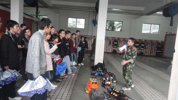 当天下午3点,所有参与此次活动的学生于三食堂广场集合后,便集体乘坐校车,开往目的地――徐州消防特勤中队。到达目的地后,消防队队长代表消防队接待了所有学生。首先,他为大家介绍了一些破门器材和水下打捞器材。在火灾营救的过程中,破门救人是一项很重要的环节,所以破门仪器不仅要制作精良,还必须被单独安放。随后,他又讲解了各种消防车的相应功能和职责,例如:水罐消防车用于储水,排烟照明车用于给火灾现场提供明亮的救援环境等等。