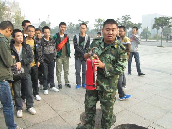 青年志愿者协会特别邀请了徐州市消防支队候山沃中队队长李亚和和孙班长,于第二食堂广场为众多在校学生演示了灭火器的使用方法。