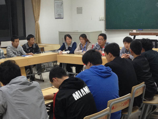 晚上七点整,同学们集聚教室。首先,班长介绍了五位新转入的同学,大家对新同学的加入表示欢迎。随后,在班长的倡议下,同学们对“爱”的含义进行了思考。大家纷纷说出自己对爱各种理解。紧接着,大家又分享在过去的一年中遇到的感动的事,有的同学说到动情处不禁红了眼圈,整个教室沉浸在一种温馨感动的氛围中。讨论持续了大约一个小时,会议的最后,班长总结了过去一年中的不足,并发表了自己对未来一年班级建设的规划,规划中,班长任青刚特别提到“让爱把我们凝聚在一起,让爱使我们进步。”大家纷纷表示,在未来的一年中会紧紧团结在安全11-4班这个集体中,在这样一个集体中共同学习、共同进步。