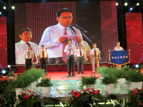 的办学历史、教学精神及矿大特色,并向同学们提出了美好的希望。之后,各学院领导分别上台发言,安全学院执行院长周福宝简单介绍了安全学院的专业特色,言辞恳切,深入人心,鼓励新生满怀热情,坚定信念学好专业知识,以饱满的信心迎接大学生活,同时,安全学院学生会主席路世远也登台与新生见面。随后,安全学院张捷勇同学为新生献上动感的歌曲,现场气氛十分活跃。在精彩的才艺表演过后,开学典礼在校歌中圆满落幕。