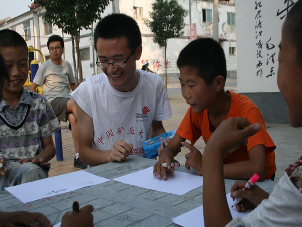 一张张石桌石凳上挤满了闻讯前来的留守儿童,一旁的大学生们微笑着与他们进行互动。课业辅导前,为激发孩子们的兴趣,大学生们与留守儿童进行了画画游戏。拿着手中的画笔,孩子们扑在石桌上在白纸上留下了自己稚嫩的笔迹,边画着,边与一旁的大学生讲解所画内容。实践团的成员们边倾听,边鼓励,为留守儿童发出的爽朗的笑声而喜悦不已。