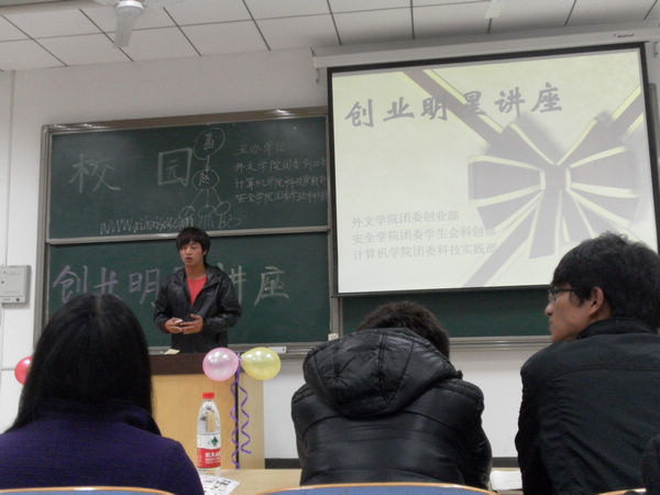 在主持人简洁的开场白之后讲座正式开始,精英团队代表赵宇飞首先向大家介绍了精英团队的团队结构、创业方向、发展前景等。随后,他和来自安全学院的搭档孙福兵一起,以幽默而通俗的语言和同学们就如何平衡学习和创业这个备受关注的问题以及他们各自的创业目的和人生方向的选择等方面进行了讨论。紧接着创业女大学生代表俞蕾走上讲台,和同学们分享了她开网店、搞格子铺、卖水果、做校园代购等创业经历,并通过自己的经历告诉同学们应该如何去创业和在创业过程中遇到问题该如何去解决。