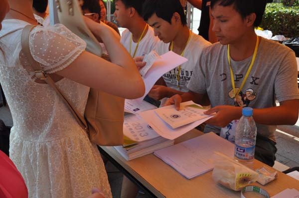 位于三食堂广场的迎新点上,辅导员和老生们忙碌的身影随处可见,从核实新生信息到发放校园卡再到发放宿舍钥匙等等,每个环节始终有条不紊地进行着。其中一个环节便是向前来报道的同学们发放新生手册。
