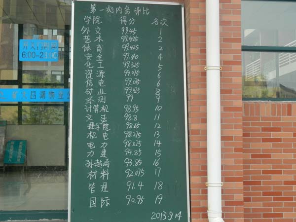 9月15日上午,第一次内务检查结果公布。通过本月13号学校武装部的老师和各学院负责人,及全体2013级新生辅导员组成的军训内务检查评审团对各学院新生的内务整理情况展开了细致的检查评比,韩国三级