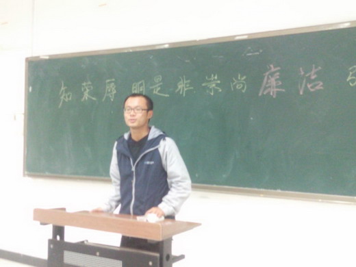 首先,以班长和团支书为代表的各个班委就这一主题依次进行发言,呼吁同学们要心中有廉洁。接着,全体同学进行了积极踊跃的发言,其中以“我的爸爸是李刚”与“雷锋精神”为话题的廉洁主题讨论尤其激烈,以刘康为代表的同学认为真正意义上的廉洁在现实社会中是不存在的,也是不允许存在的。而以邓文奇为代表的同学则认为:诚然我国仍存在很多腐败问题,但廉洁工作正朝着好的方向一步步进行,相信中国最终会迎来“廉洁”的春天。李成刚老师就两个话题做了深刻的剖析,并对两方的观点做了客观理性的总结。此外,很多同学都发表了自己对廉政问题的看法,各有千秋,整个班会气氛活跃。最后,李老师对同学们所讨论的问题做了一些解释和补充,并鼓励同学们要发扬廉洁精神,要对中国廉洁的未来发展充满信心。